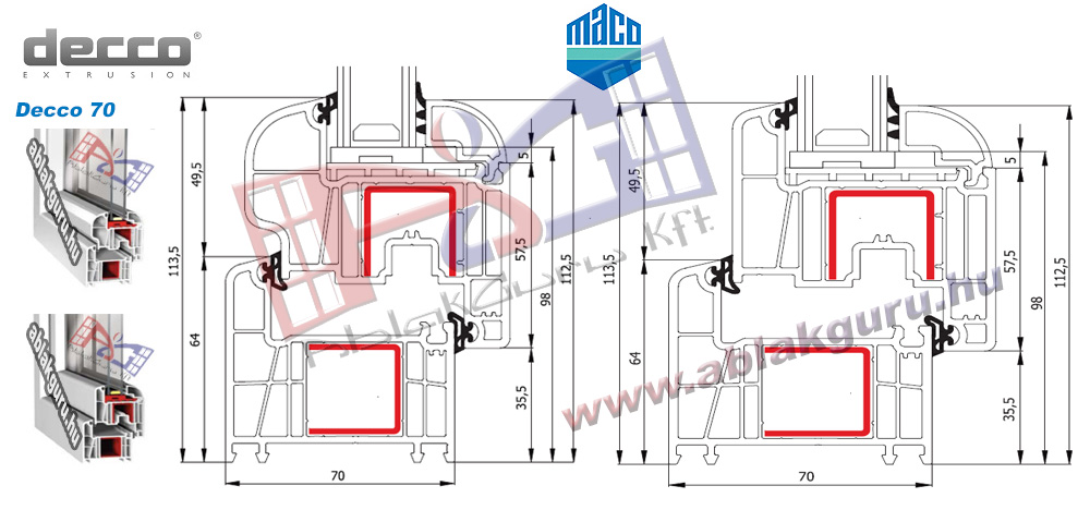 Profil: Decco 70Beépítési mélység: 70mmLégkamrák: HatGumi: kettőSzín: RAL 9003 Vasalat: MACO multi-trend Üveg: 4-16AR-4 Gyártás: Péntektől 12 nap Raktárkészlet:VAN!!!